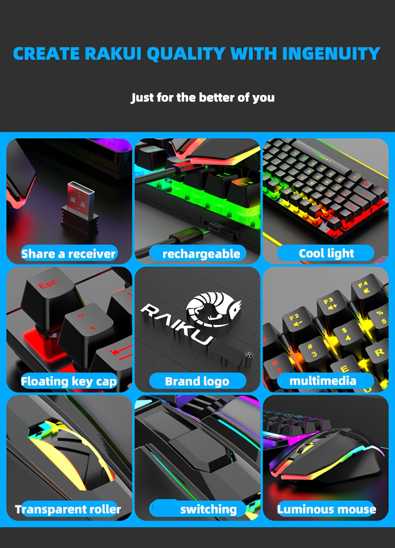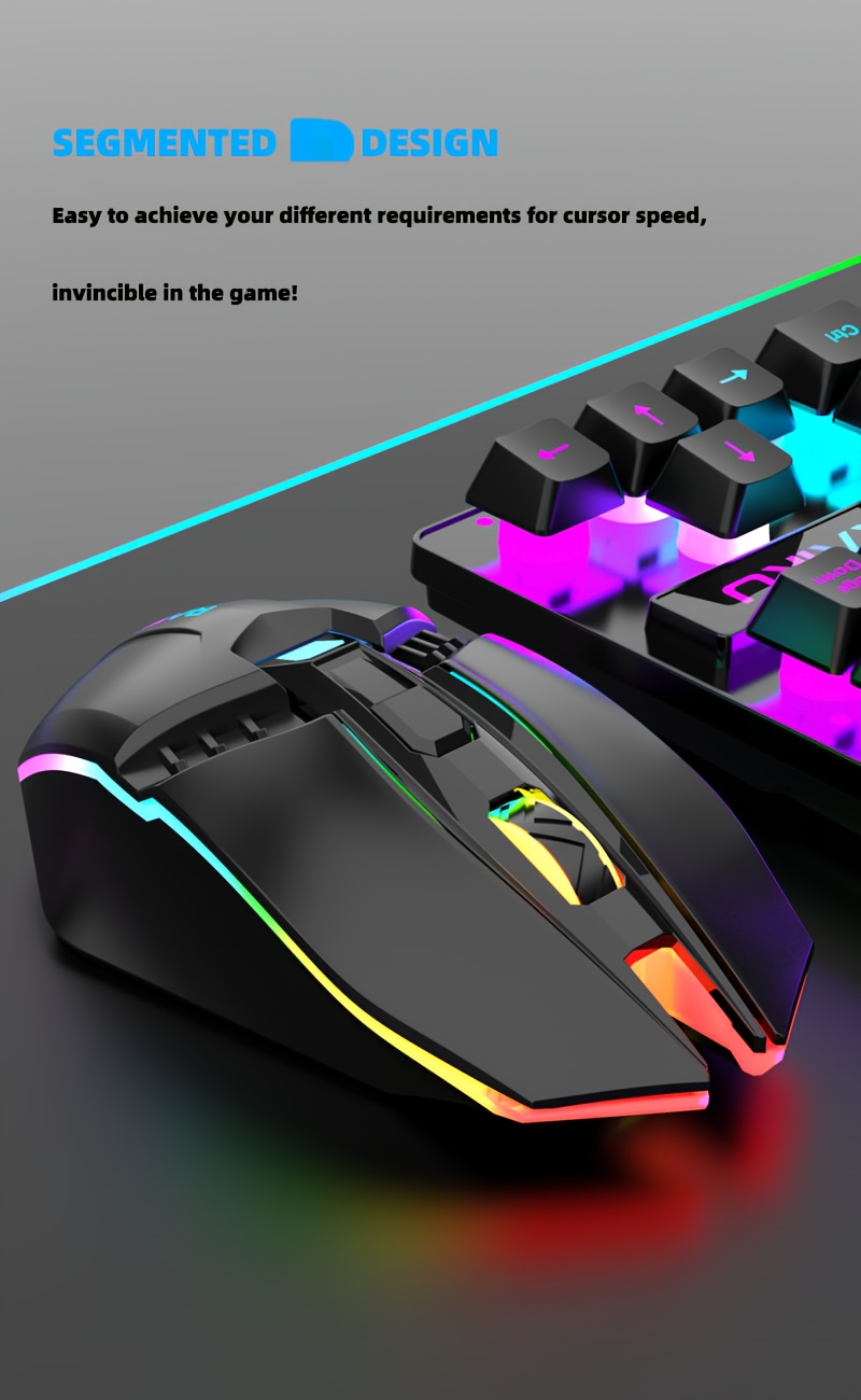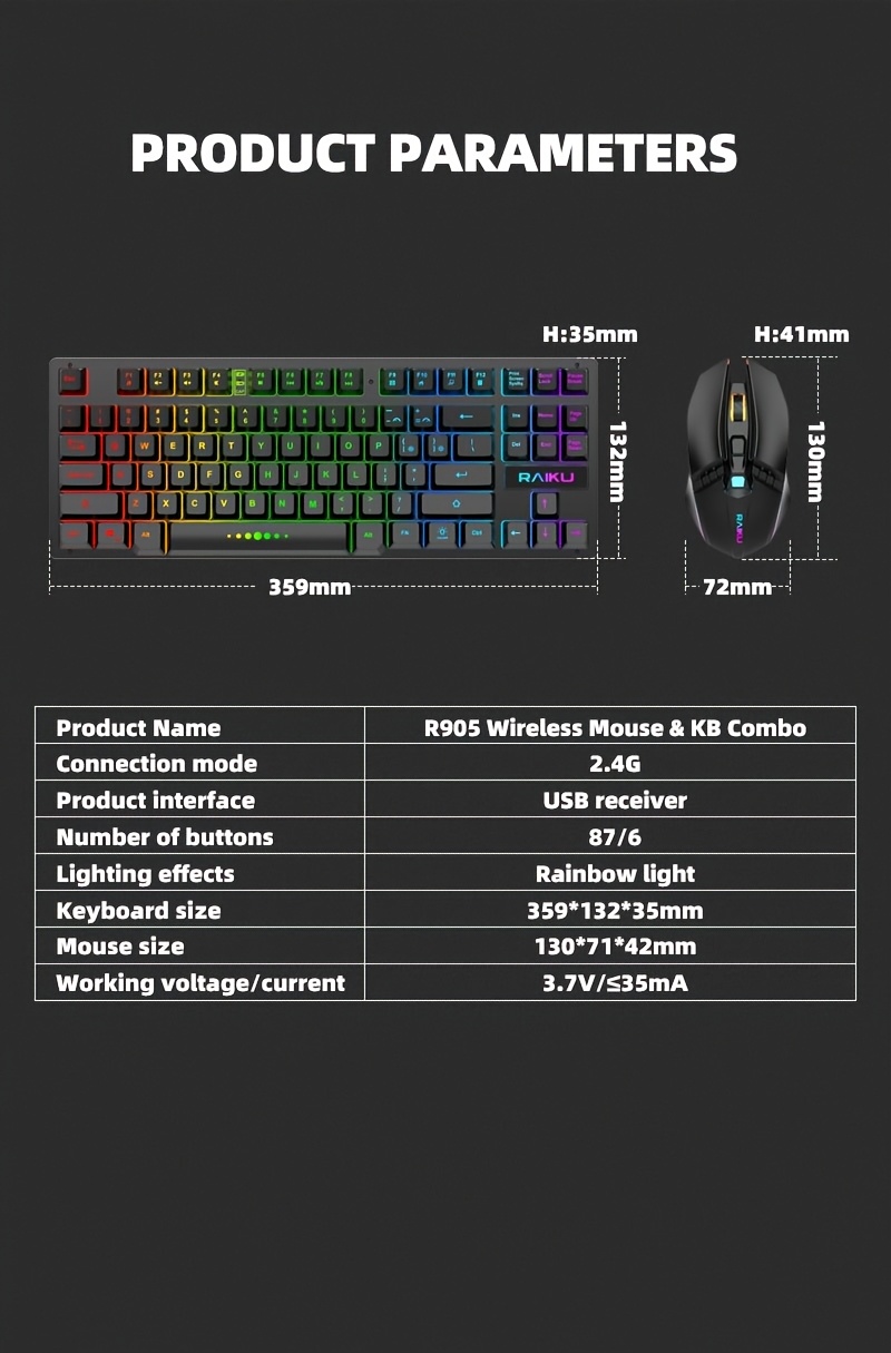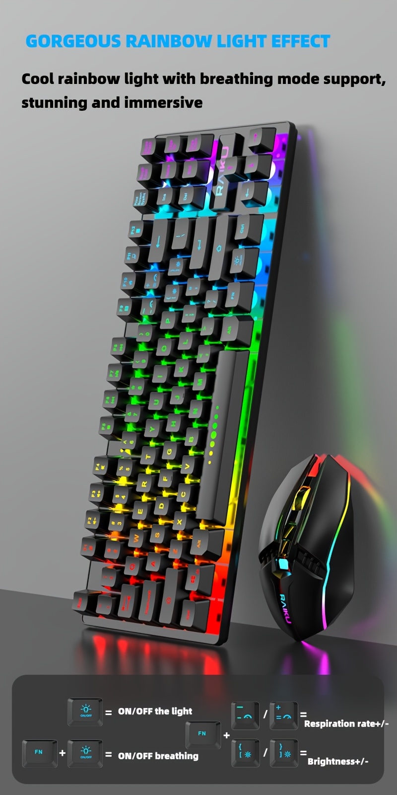 2.4G Wireless Keyboard and Mouse Set with RGB Lighting, Rechargeable Batteries, and 10m Range