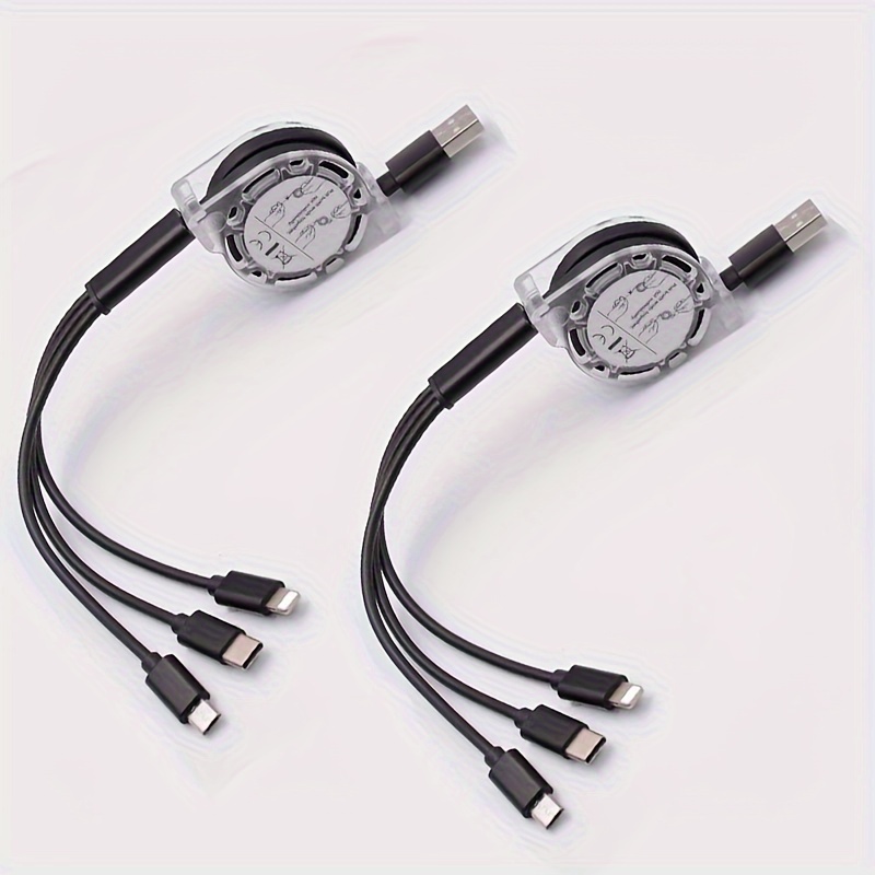 2 Piece Set of 3-in-1 Retractable PVC Fast Charging Cables with Multiple Connectors