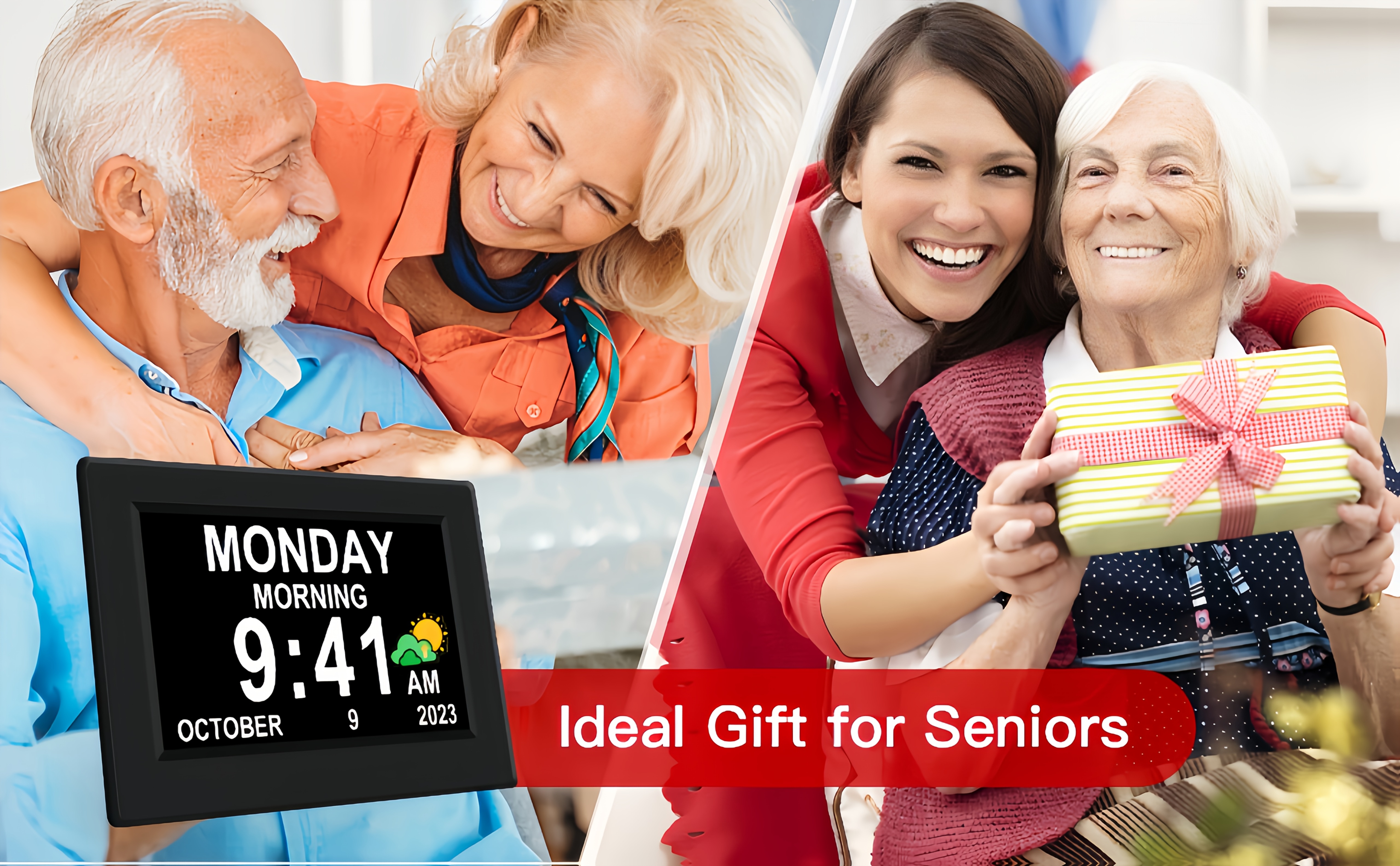 The device features three types of clocks: an Elderly Clock tailored for seniors with a large, clear font showing the date, year, month, and time for easy reading; a Wall Clock that complements living room decor while displaying the time beautifully.