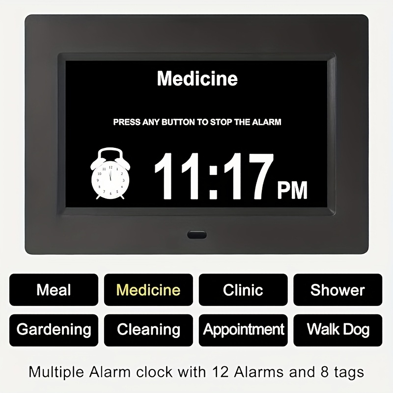 7 Inch Black Digital Clock with Large Display and Alarms for Seniors