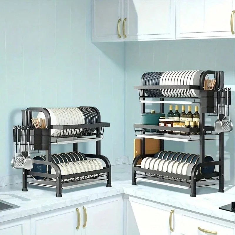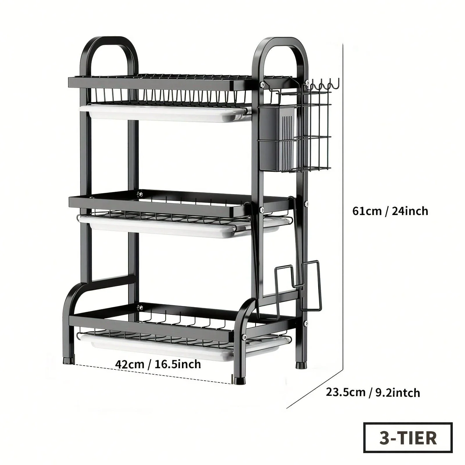 Black 3-Tier Iron Dish Rack for Kitchen Countertop Storage