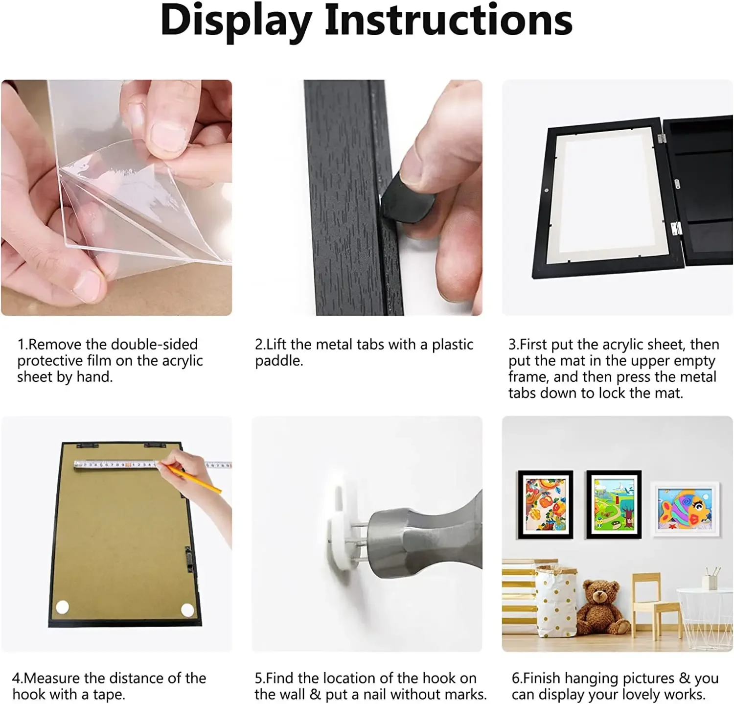 4.Perfect for your child's cherished artwork; frame opens like a book and has elastic straps on the interior to allow for artwork storage; includes a white beveled mat and hanging hardware for hassle-free display in both horizontal and vertical formats to hang flat against the wall