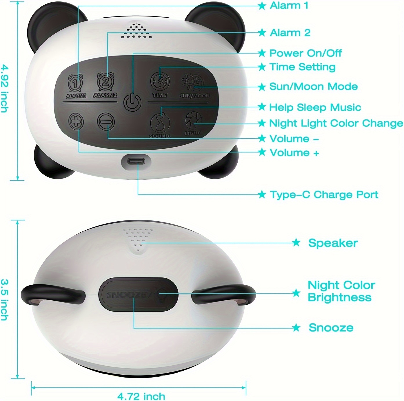 About this item:*The sun and moon icons teach children when to go to bed and wake up.*7 types of white noise better help children fall asleep*5 color lighindividuals to choose from as a night light. 4 fixed lighindividuals and 1 dynamic light. *Dual Alert clo and “snooze” mode in 12/24 hour format with 4 levels of adjustable volume. *You can also choose the voice sensing function to save power