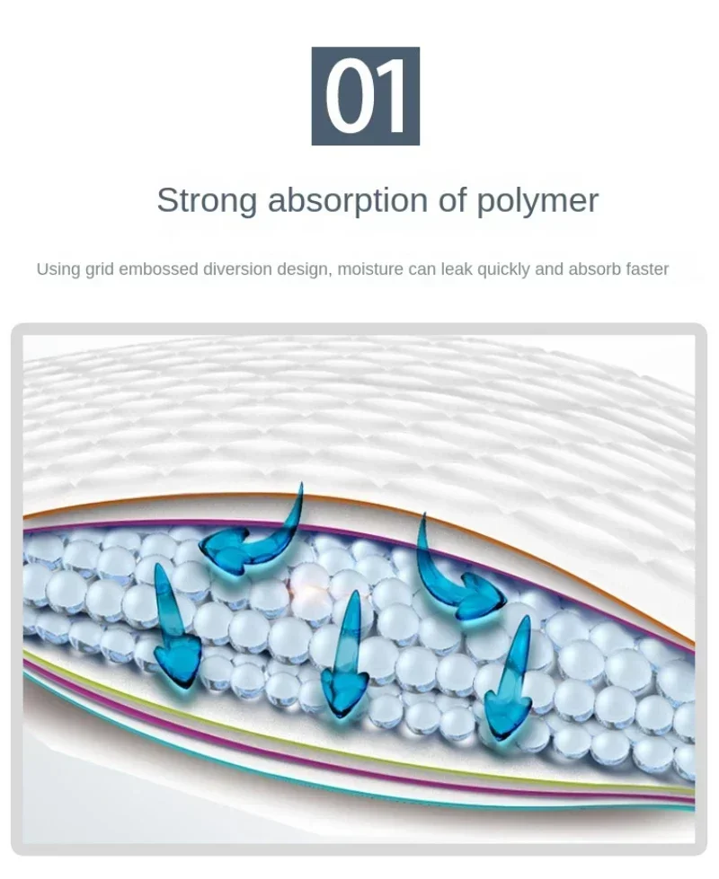 - Upper layer of non-woven fabric for quick water absorption, refreshing and deodorizing.