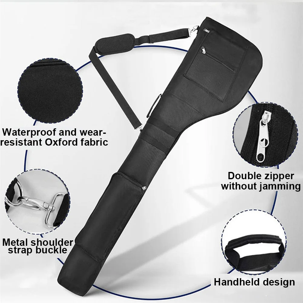 Features: 1.Sturdy Nylon Construction: Our golf sunday bag features a design with high-quality nylon material, ensuring longevity and resistance to wear and tear. Perfect for enthusiasts seeking a reliable, long-lasting golf club bag. 2.Ample Storage Space: The mini golf bag can comfortably hold 8-10 clubs and includes three front pockets for easy access to essentials like balls, tees, and gloves, keeping everything you need within arm's reach. 3.Convenient Foldable Design: This golf carry bag is easy to fold, occupying minimal space in trunks, trailers, or campers, making it ideal for practice ranges, courses, or travel without the bulk. 4.Comfort and Grip: Padded shoulder straps and side handles make carrying the golf travel case effortless, complemented by a non-slip base to prevent slipping, suitable for both men and women. 5.Perfect Gift for Golfers: This stylish and portable travel golf carry bag makes an ideal gift for parents, husbands, or brothers on special occasions, enhancing their golfing experience. Specification: Origin: Mainland China Size: 126x32cm 49.6x12.6inch Material: Nylon Color: Black Adjustable shoulder strap, waterproof