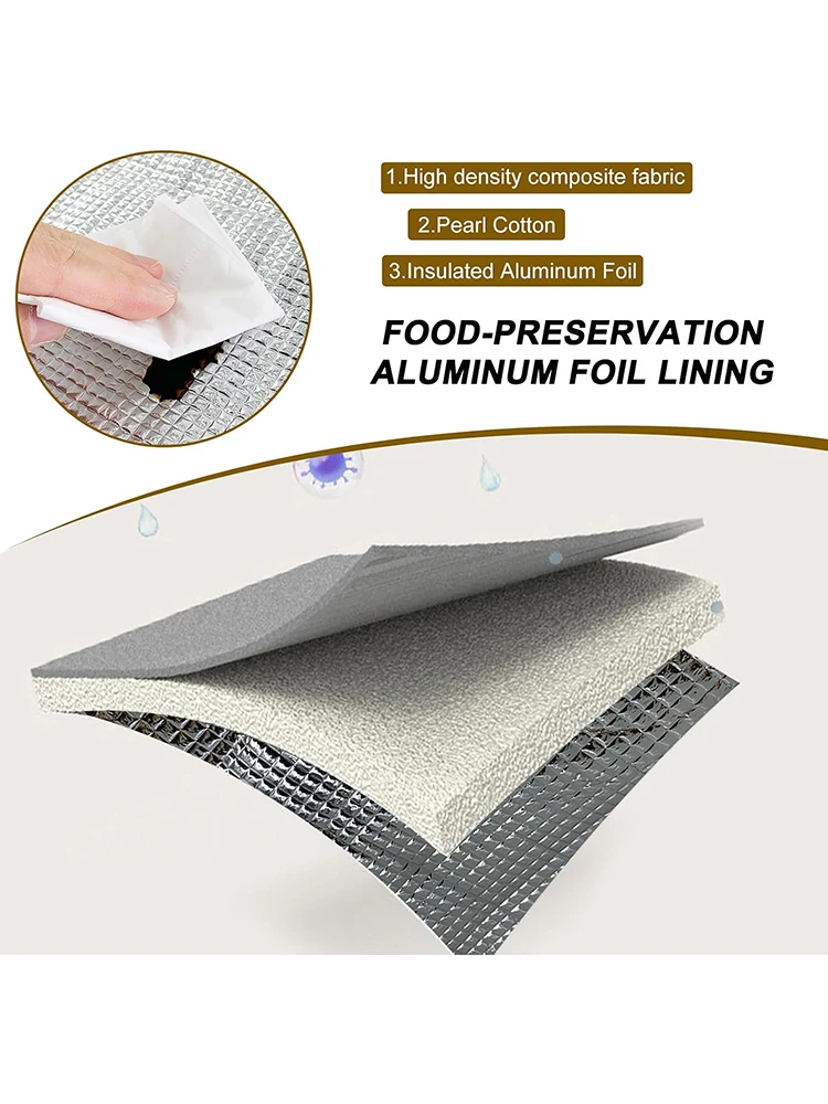 Reusable insulation: This insulated lunch bag is made from a high-density composite canvas fabric. Lined with food-grade safe aluminum foil with excellent insulation and leak-proof properties, this freezable lunch bag keeps your food warm/cold/fresh for hours. Stains on the lining can be wiped with paper towels, saving a lot of time