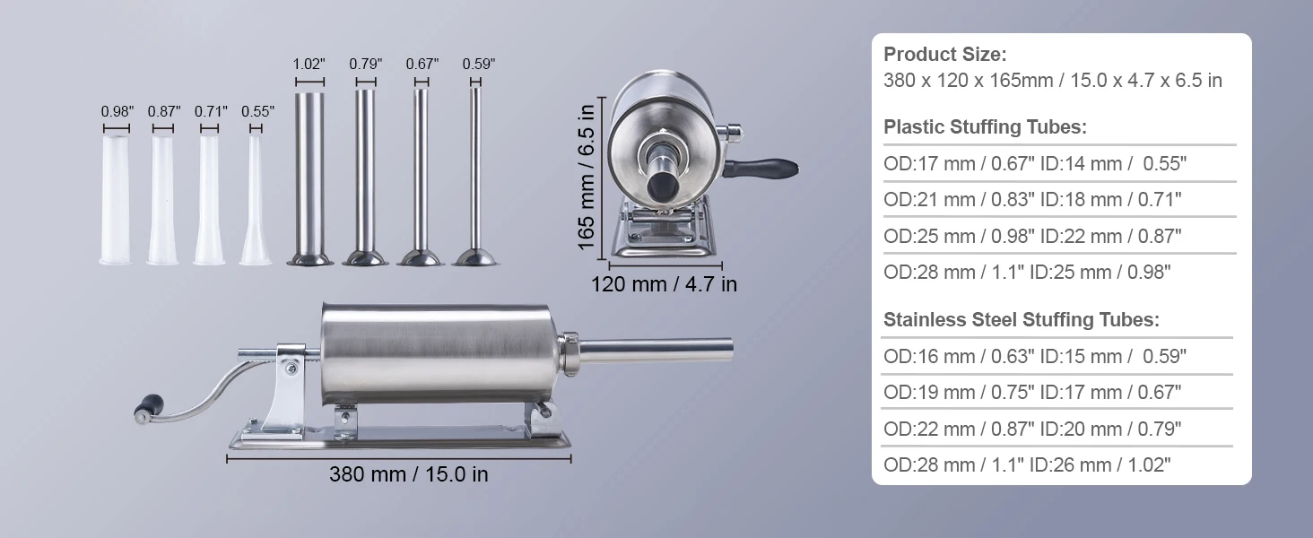 8 Sausage Tubes: Includes 2 materials (stainless steel & plastic), with 8 sausage tubes of various diameters suitable for making thin Italian sausages, flavored chorizos, and thicker meat sausages.