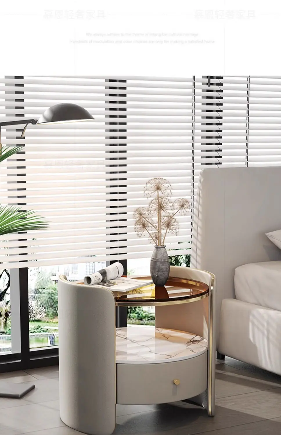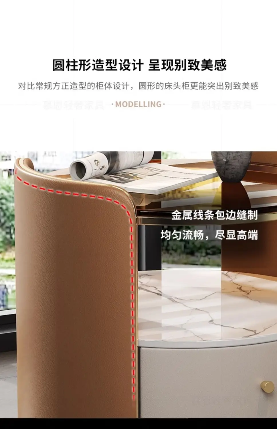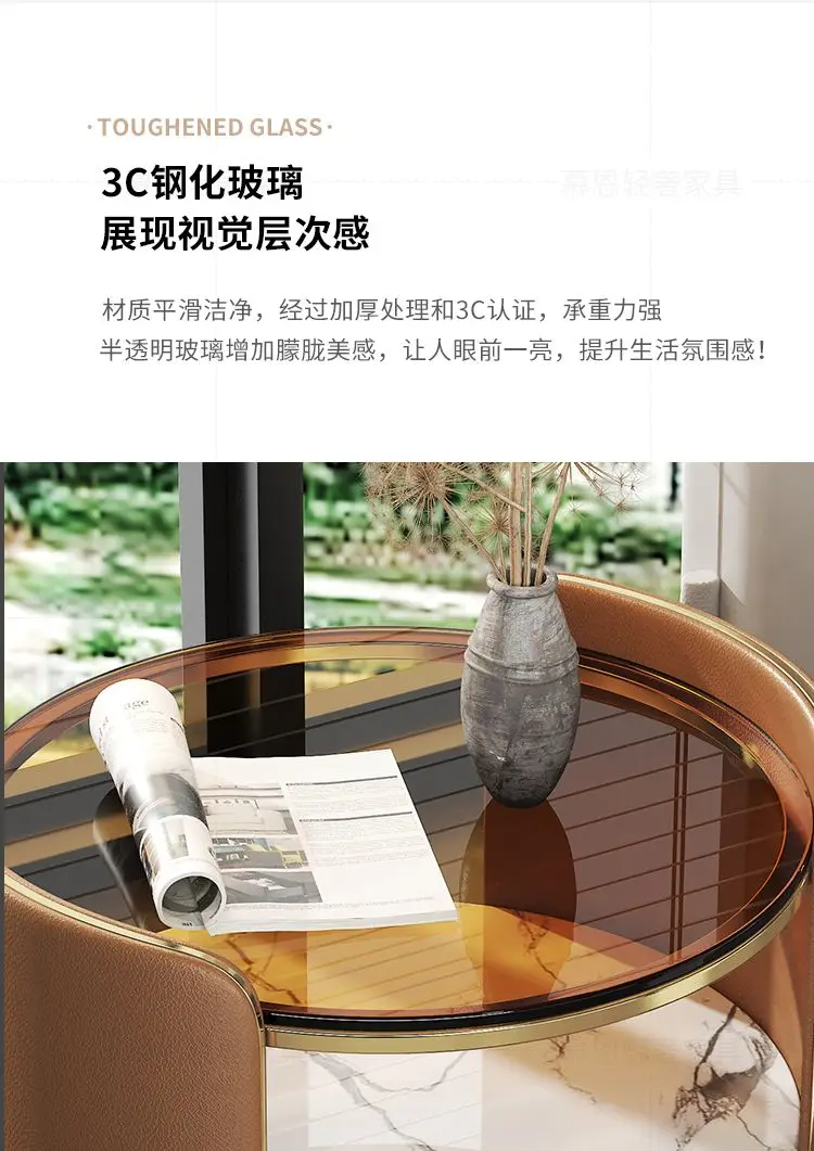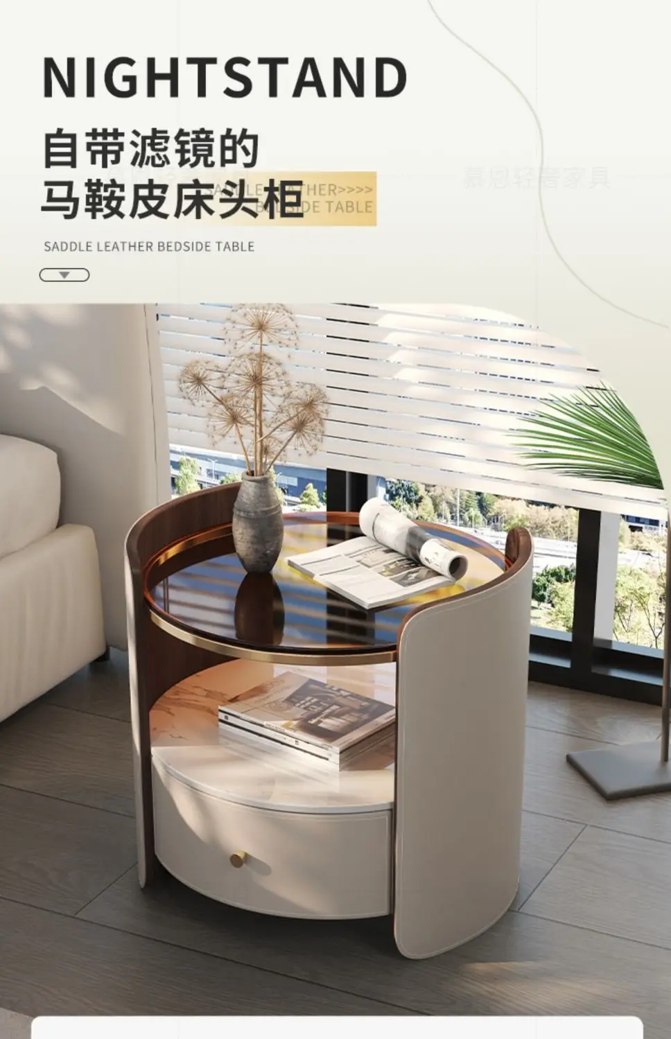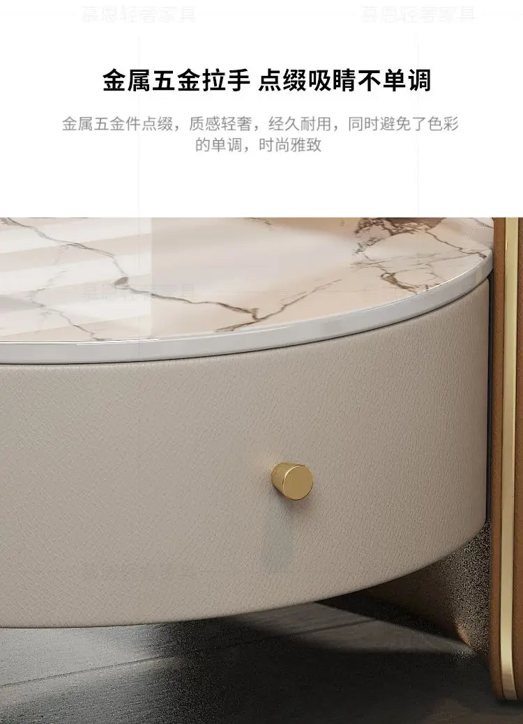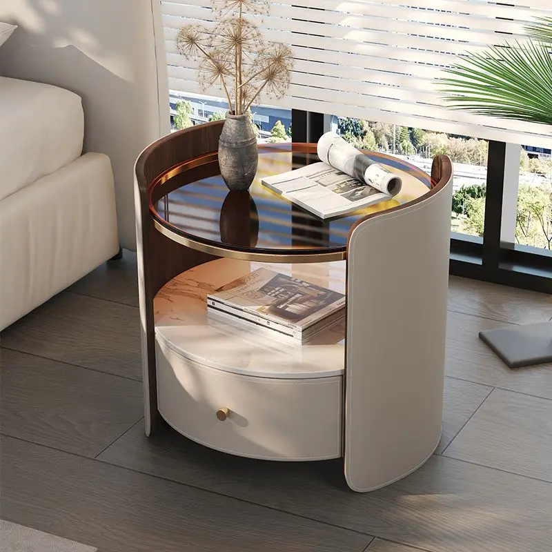 Modern Round Bedside Table with Leather Finish and One Drawer