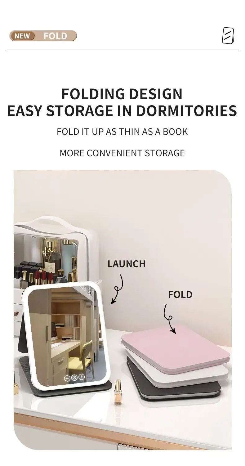 LED Makeup Mirror 3 Colors Light Portable Vanity with Adjustable Brightness USB Charging Foldable for Travel And Home Use