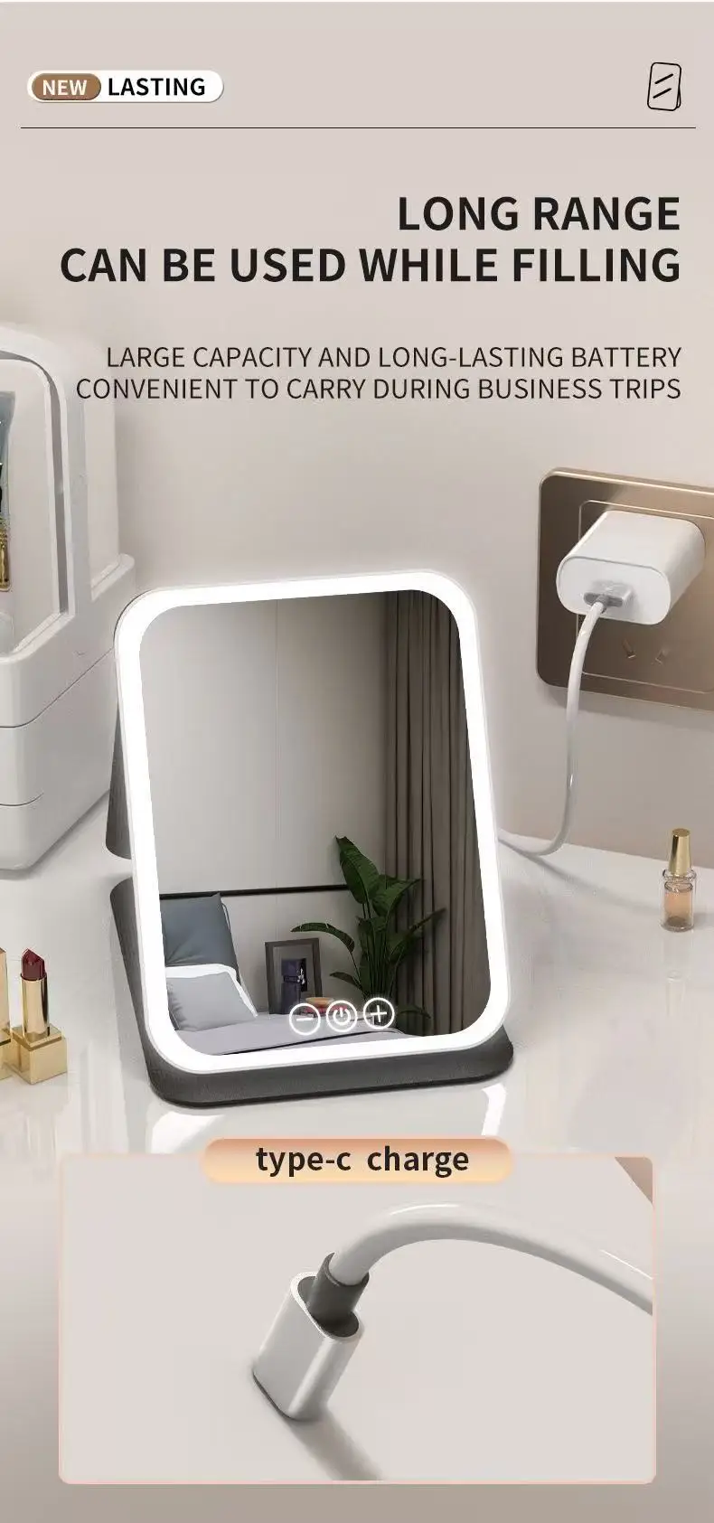 Portable LED Makeup Mirror with 3 Light Colors and Adjustable Brightness