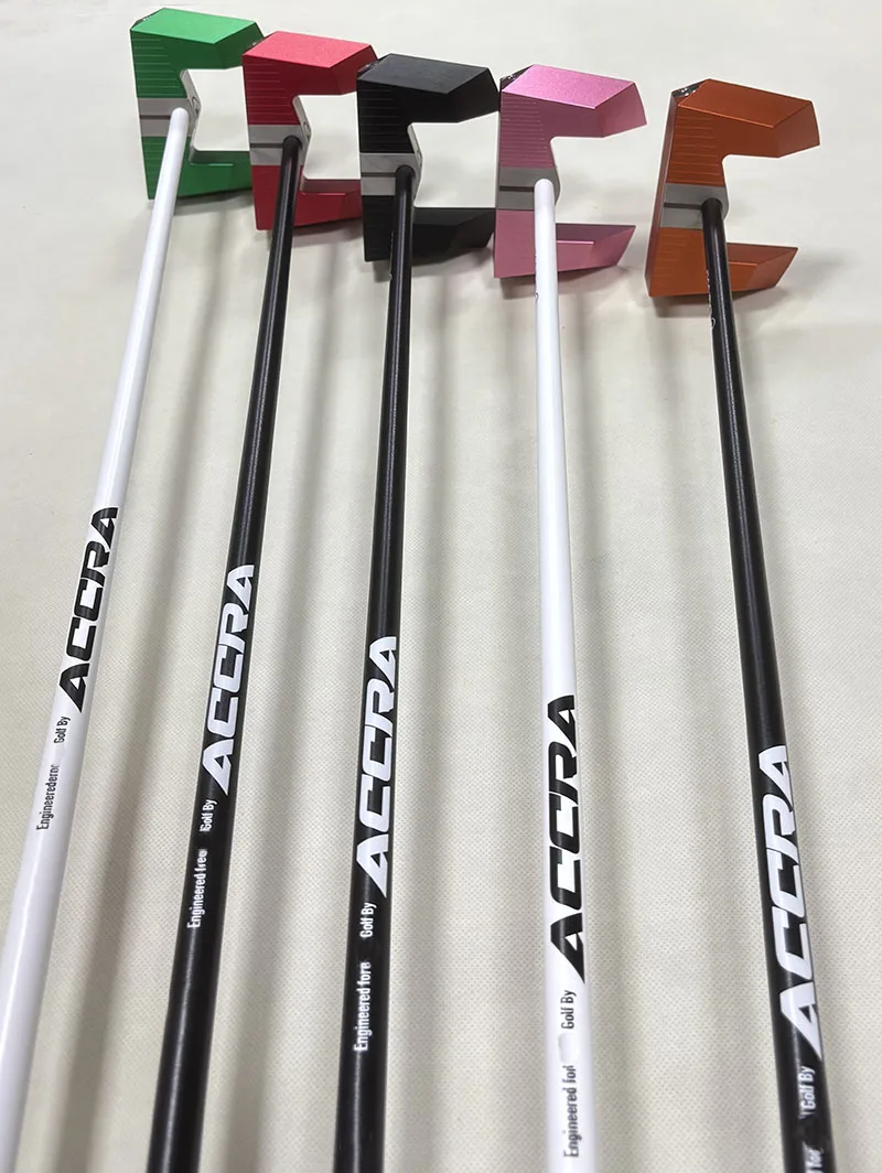 The black, blue, orange and red heads use a black shaft and black grip, while the pink and green heads use a white shaft and white grip