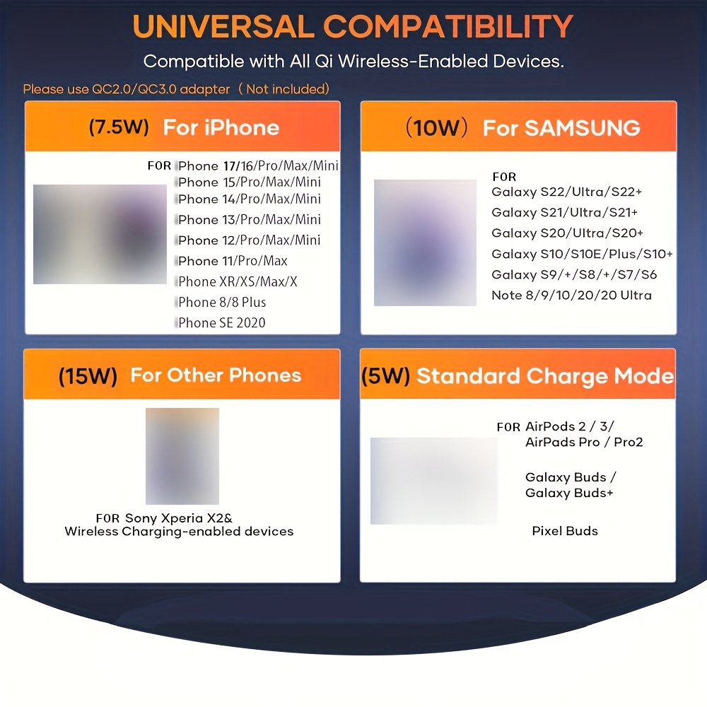 Wide Compatibility: Supports 15W/10W/7.5W output. Our wireless charger is compatible with all phones that support wireless charging. So, if your phone supports wireless charging, buy it!