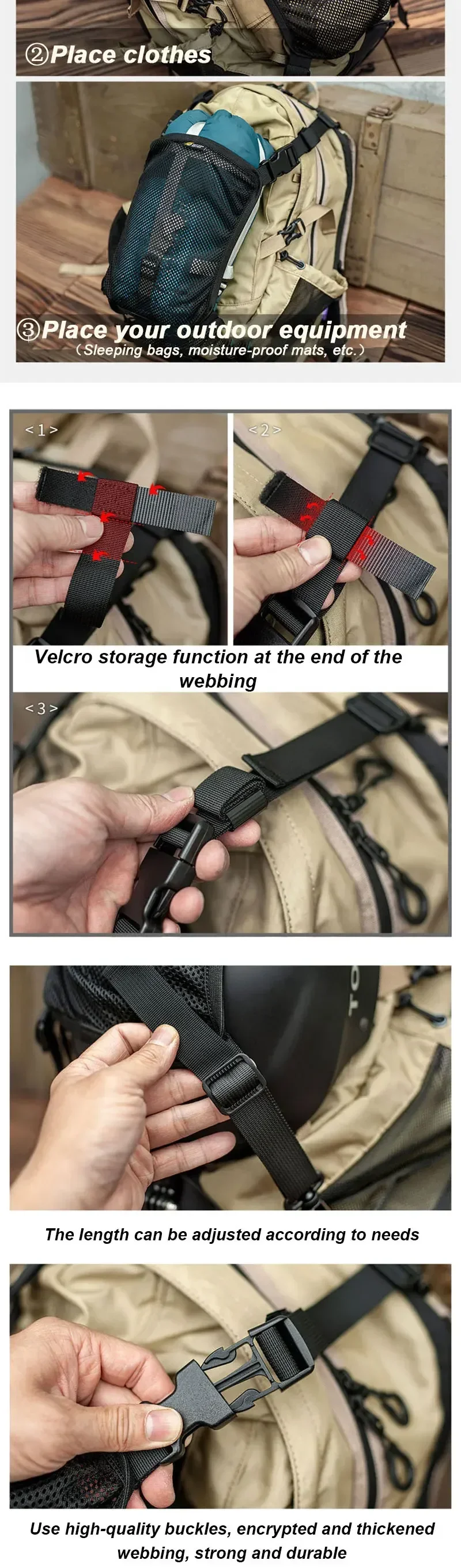 1. Expanded backpack external mounting function, thickened mesh, high elastic edging, encrypted thickened webbing, sturdy and durable.