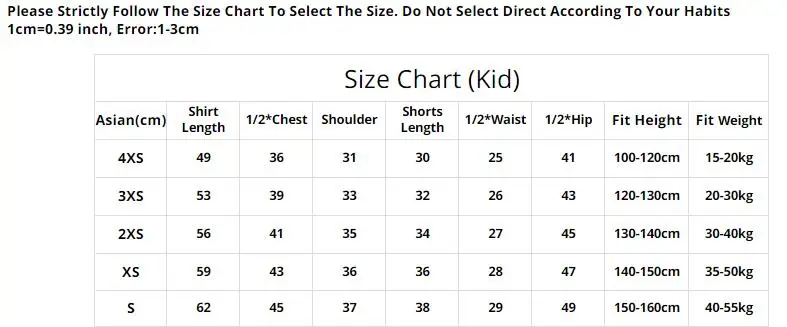 Kids size 3XS:suitable for kids height 115-125cm, weight 20-30kg;
