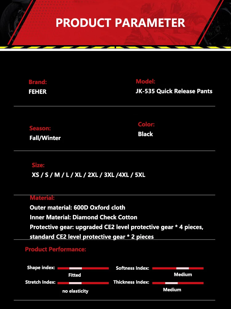 Motorcycle pants specifications and parameters, size