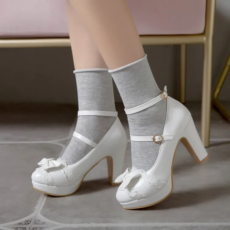 Women's High-Heeled Pumps with White Lace and Thick Heel