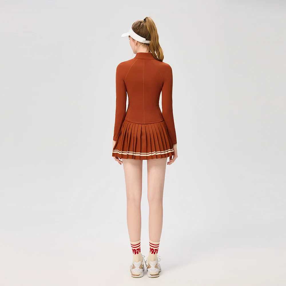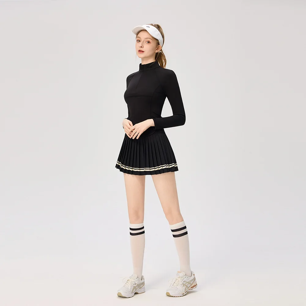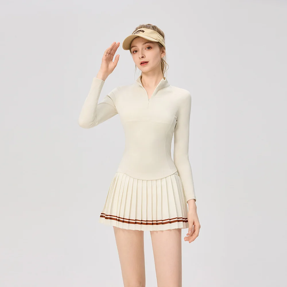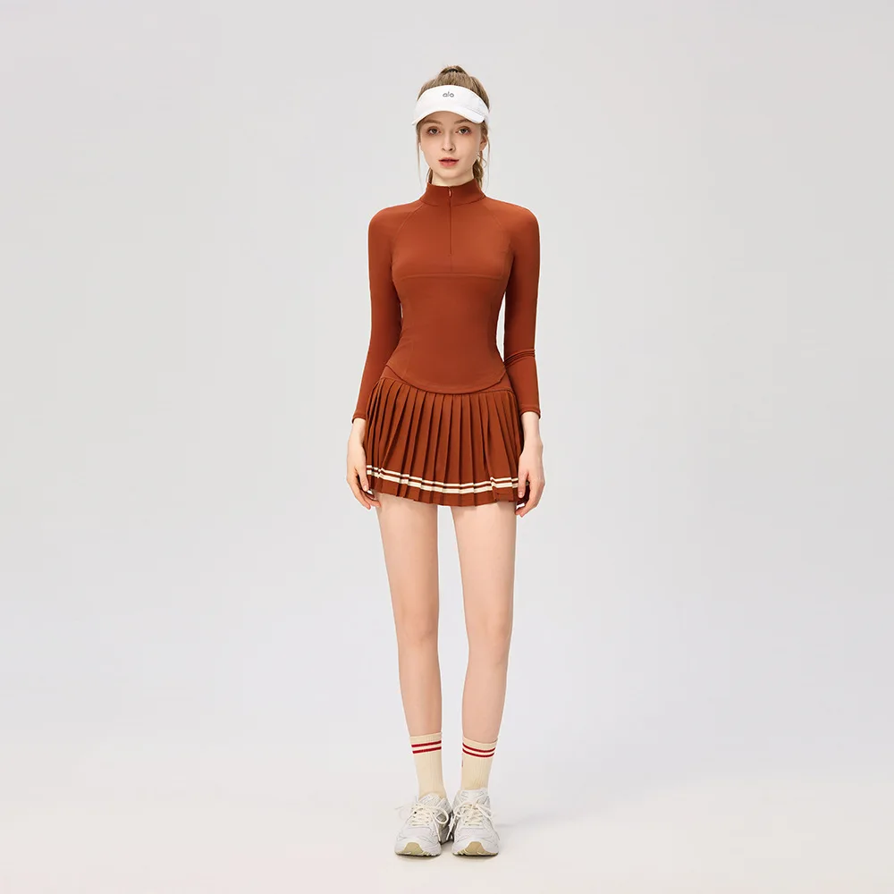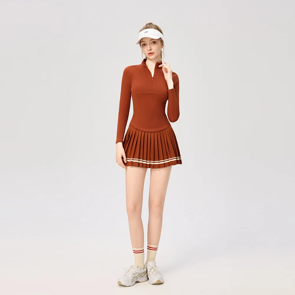 Feature: Zipper Polo Collar, Breathable, Long Sleeve, Slim, Bodycon,Soft, Pleated, A-lined, High Waist, with short, vintage