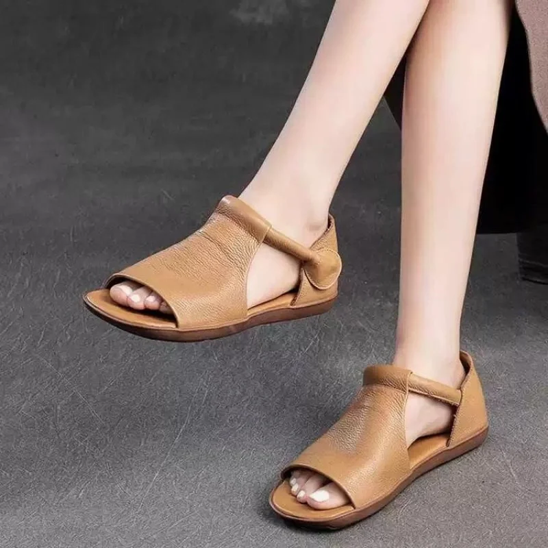Women's Peep Toe Flat Sandals with Artificial Leather Upper
