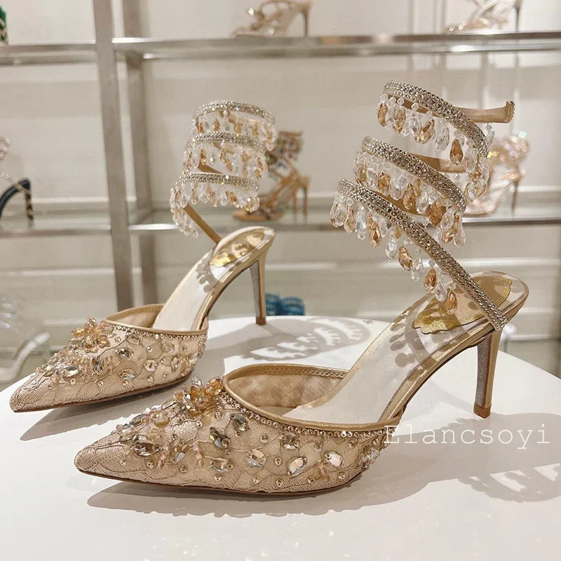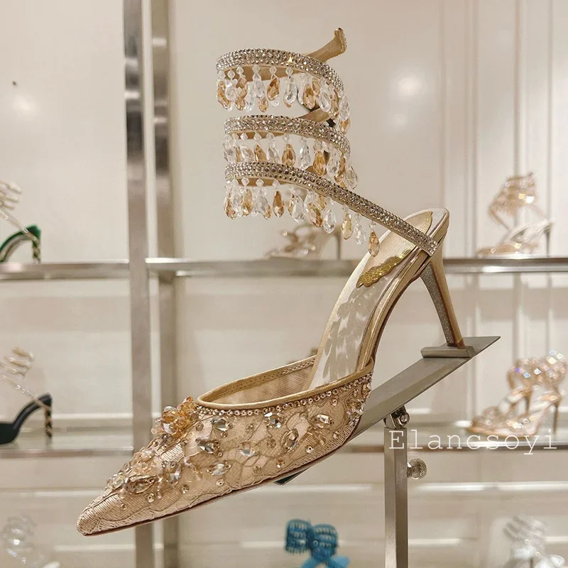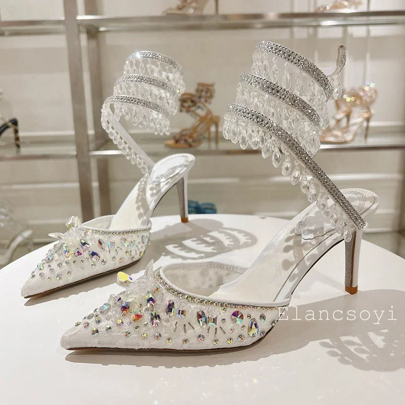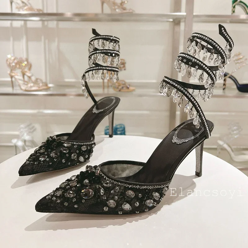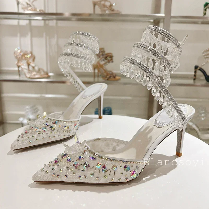 Fashion High Heels Sandals Women Shiny Crystal Tassel Snake Shaped Winding Wedding Shoes Summer Pointed Toe Stiletto Sandalias